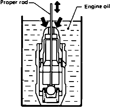 c. Remove hydraulic lash adjuster and dip in a container filled with engine oil. While pushing plunger as shown in Fig. 27. lightly push check ball using a thin rod. Air is completely bled when plunger no longer moves. Air cannot be bled from this type of lash adjuster by running engine.