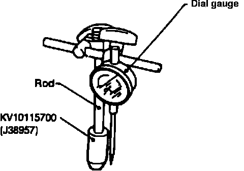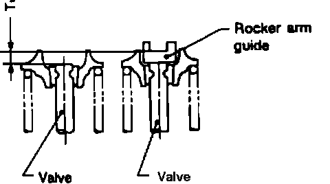 d. Measure difference T1 between sliding surface of rocker arm guide against rocker arm and valve stem end on shim side with valve, valve spring, collect, retainer and rocker arm guide installed to head (except shim). When measuring, lightly pull dial indicator rod toward you to eliminate play in tool No. J38957, Fig. 29 and 30.