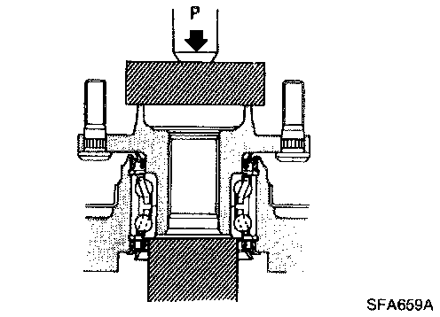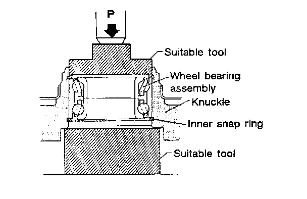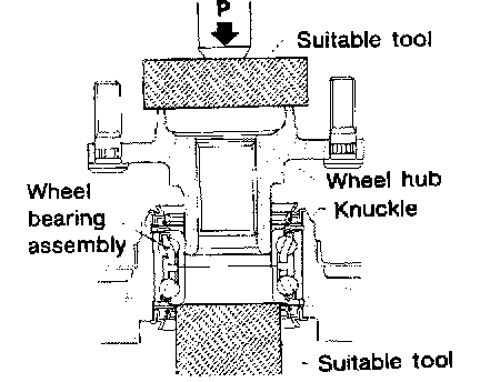 CAUTION: Do not press inner race of wheel bearing assembly. Do not apply oil or grease to mating surfaces of wheel bearing outer race and knuckle.