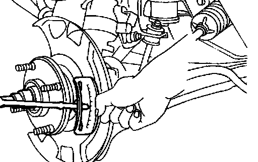 Note: Brake hose need not be disconnected from brake caliper. Be careful not to depress brake pedal, or piston will pop out. Make sure brake hose is not twisted.
