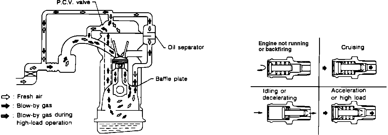 During partial throttle opening, the manifold vacuum draws fresh air through the tube connected to the air cleaner, into the rocker cover and crankcase, thereby drawing the blow-by gas through the PCV valve into the intake air stream.
