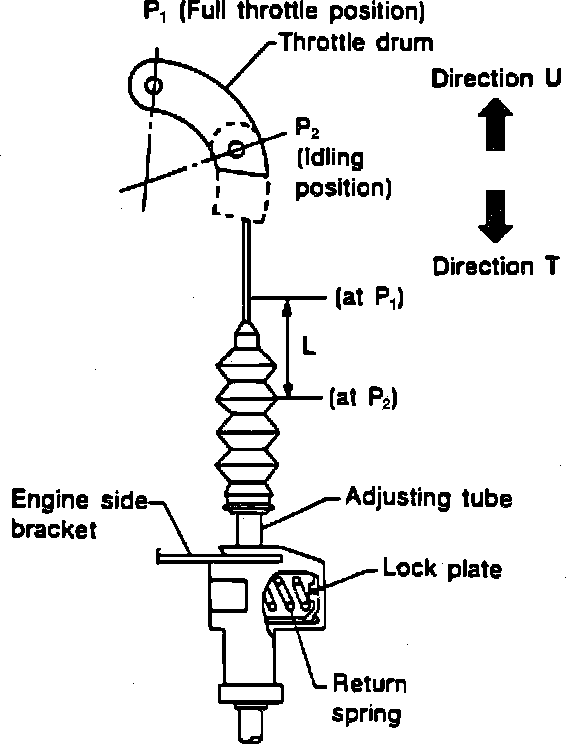 3. Move throttle drum from P2 to P1 quickly and ensure that throttle wire stroke ``L'' is within 1.54-1.69 inch on G20 and 1.079-1.236 inch on Sentra between full throttle and idle.