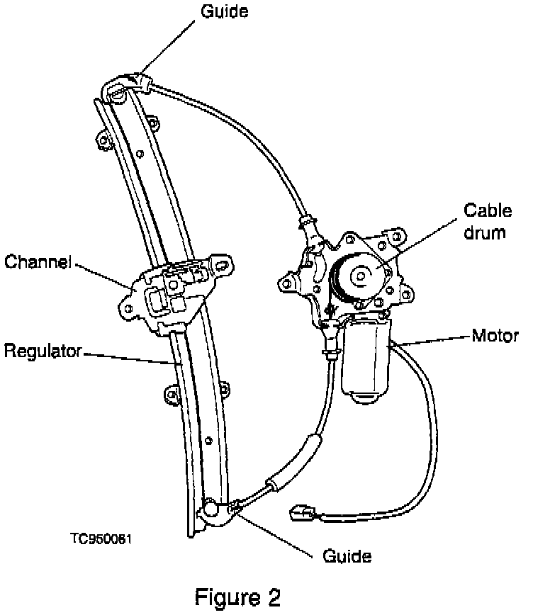 4. If noise is still present, remove the regulator and visually inspect for a frayed cable and any broken plastic guides, plastic channel or cable drum (see Figure 2). Also perform a functional check by holding the regulator channel and manually moving it up and down several times to see it any binding occurs.