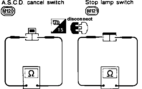 2. With brake pedal depressed, no continuity should exist at A.S.C.D. cancel switch. Release pedal, continuity should then exist.