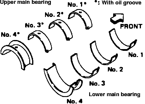 2. If crankshaft, cylinder block and main bearing are replaced, thickness of main bearings must be selected as follows: