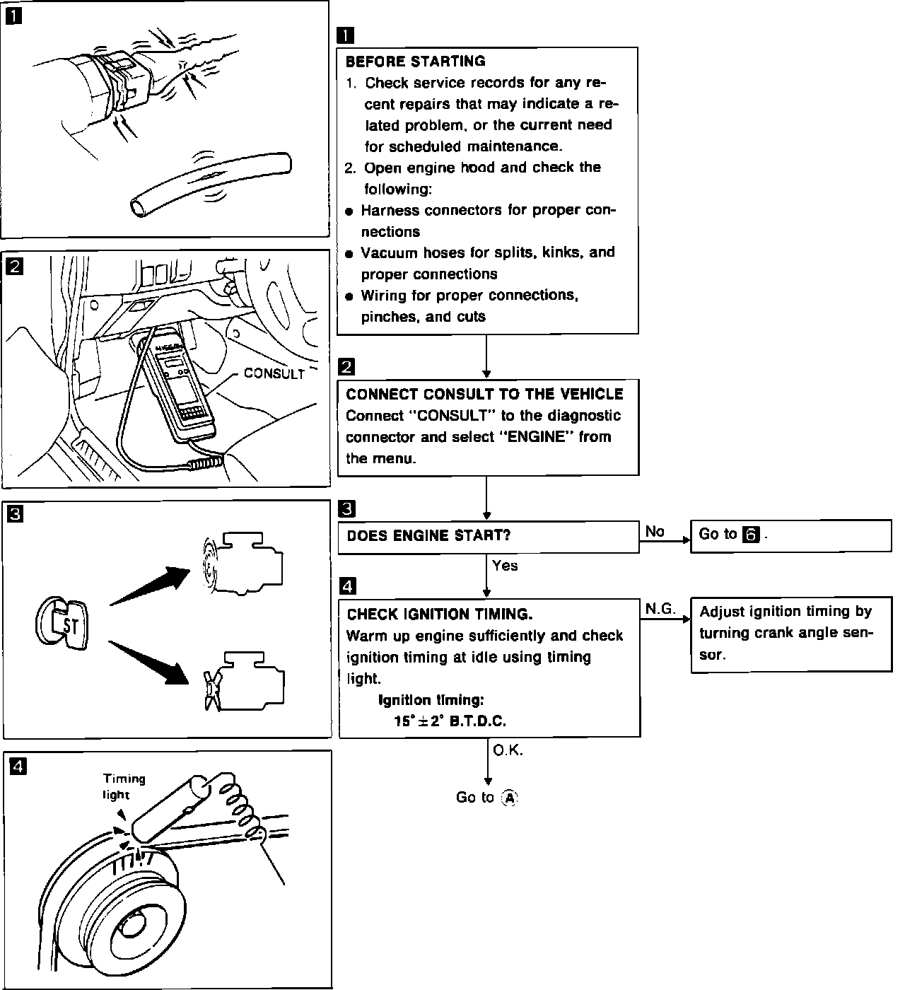 Refer to Fig. 40. for basic inspection procedure. Some diagnostic procedures may use the CONSULT unit, refer to ``Consult System Usage'' for proper application and installation.