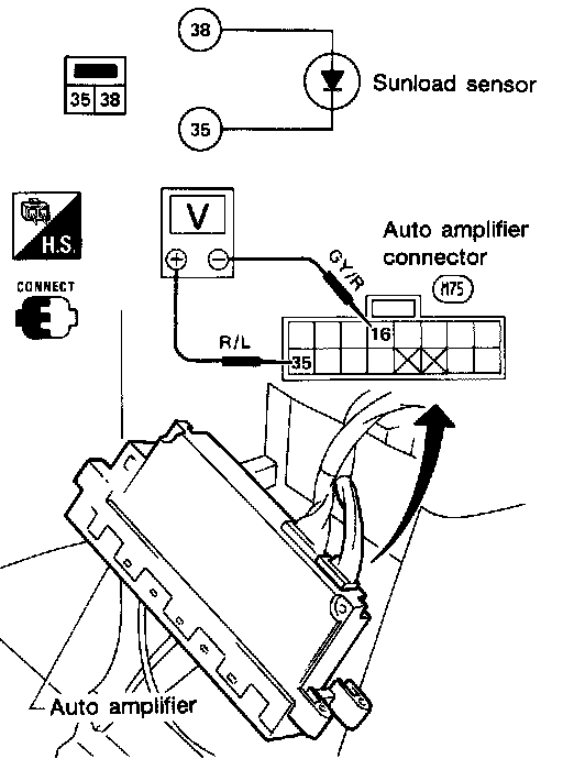 When checking sunload sensor, select a place where sun shines directly on it. Measure resistance of sensor according to the chart.