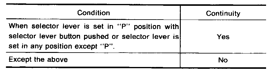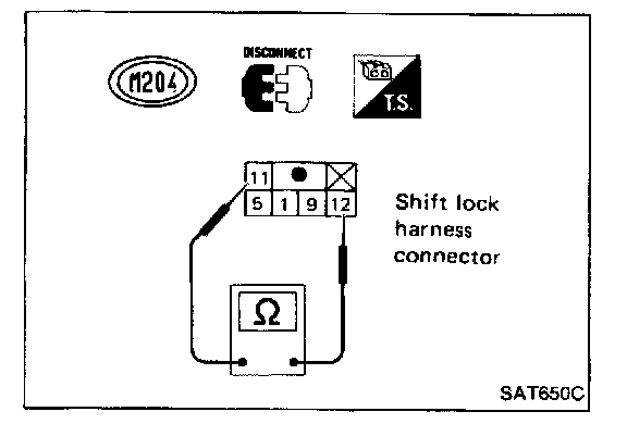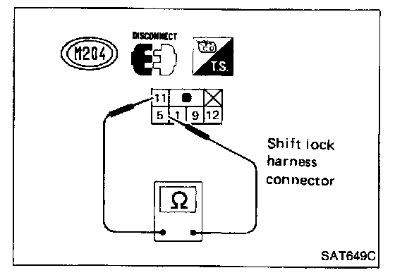 Check continuity between terminals (11) and (12) of shift lock harness connector.
