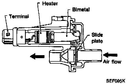 A bimetal, heater and rotary shutter are built into the IACV-Air Regulator. When the bimetal temperature is low, the air by-pass port opens. As the engine starts and electric current flows through a heater, the bimetal begins to turn the shutter to close the by-pass port. The air passage remains closed until the engine stops and the bimetal temperature drops.