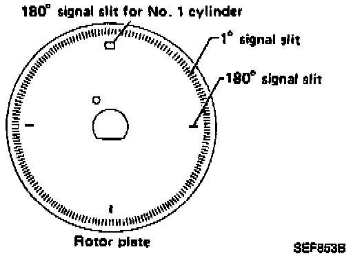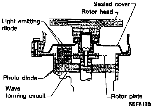 When the rotor plate passes between the L.E.D. and the photo diode, the slits in the rotor plate continually cut the light being transmitted to the photo diode from the L.E.D. This generates rough-shaped pulses which are converted into on-off pulses by the wave-forming circuit, which are sent to the ECM.