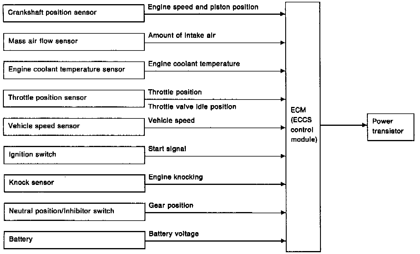 The ignition timing is controlled by the ECCS Control Module (ECM) to help maintain the best blend of engine performance and emissions under all operating conditions.