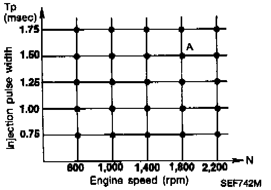 The ECM detects information such as the injection pulse width and crankshaft position sensor signal which varies every moment. Then responding to this information, ignition signals are transmitted to the power transistor. e.g. N: 1,800 rpm, Tp: 1.50 msec A B.T.D.C.