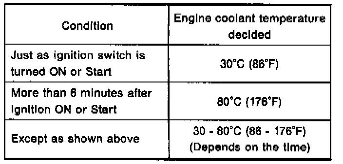 When engine coolant temperature sensor output voltage is below or above the specified value, water temperature is fixed at the preset value as shown in image.