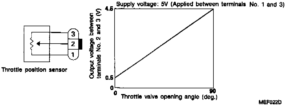 The throttle position sensor responds to the accelerator pedal movement. This sensor is a kind of potentiometer which transforms the throttle position into output voltage, and emits the voltage signal to the ECM. In addition, the sensor detects the opening and closing speed of the throttle valve and feeds the voltage signal to the ECM.