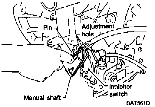4. Insert 4.0 mm (0.157 in) dia. pin into adjustment holes in both inhibitor switch and manual shaft as near vertically as possible.