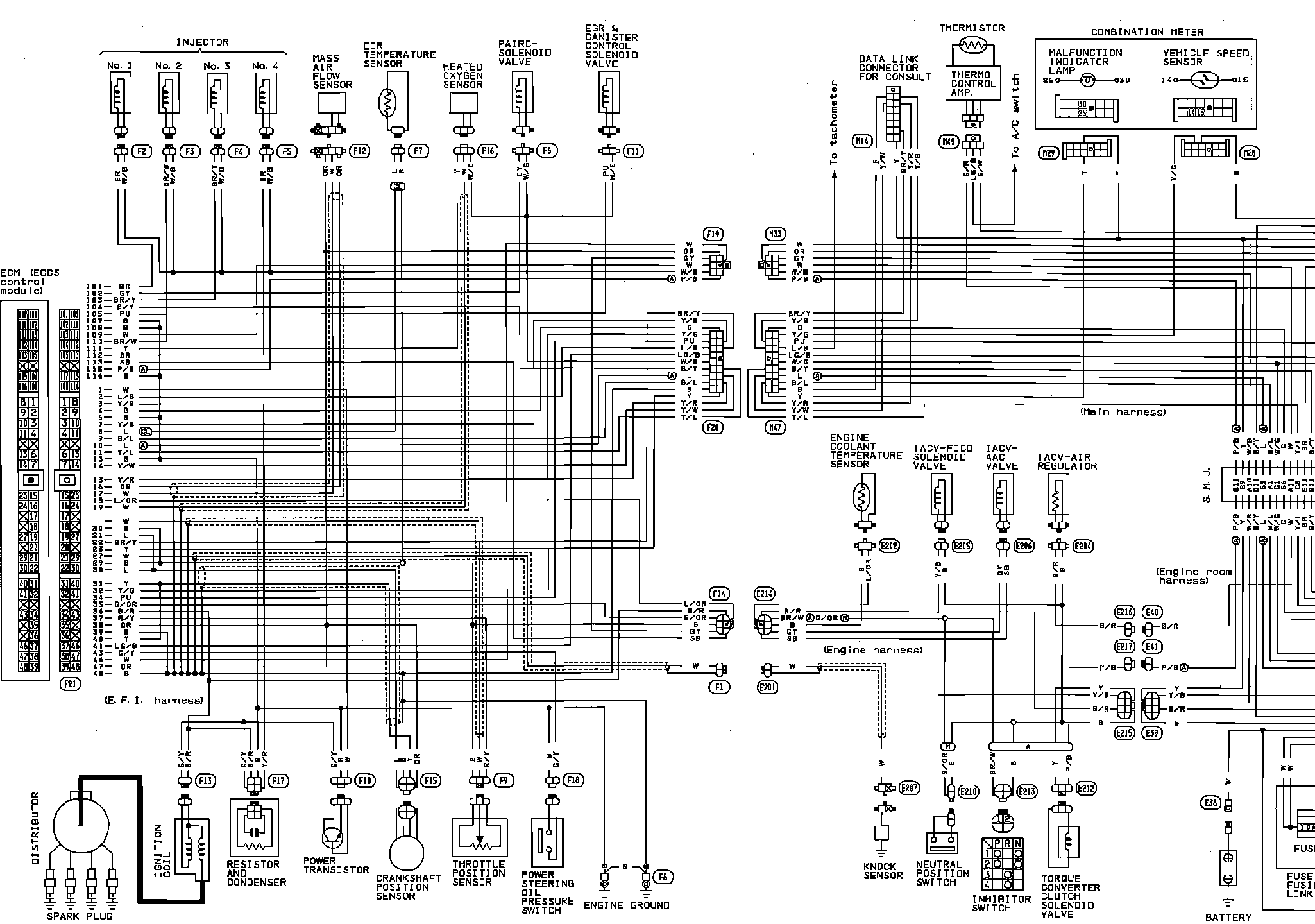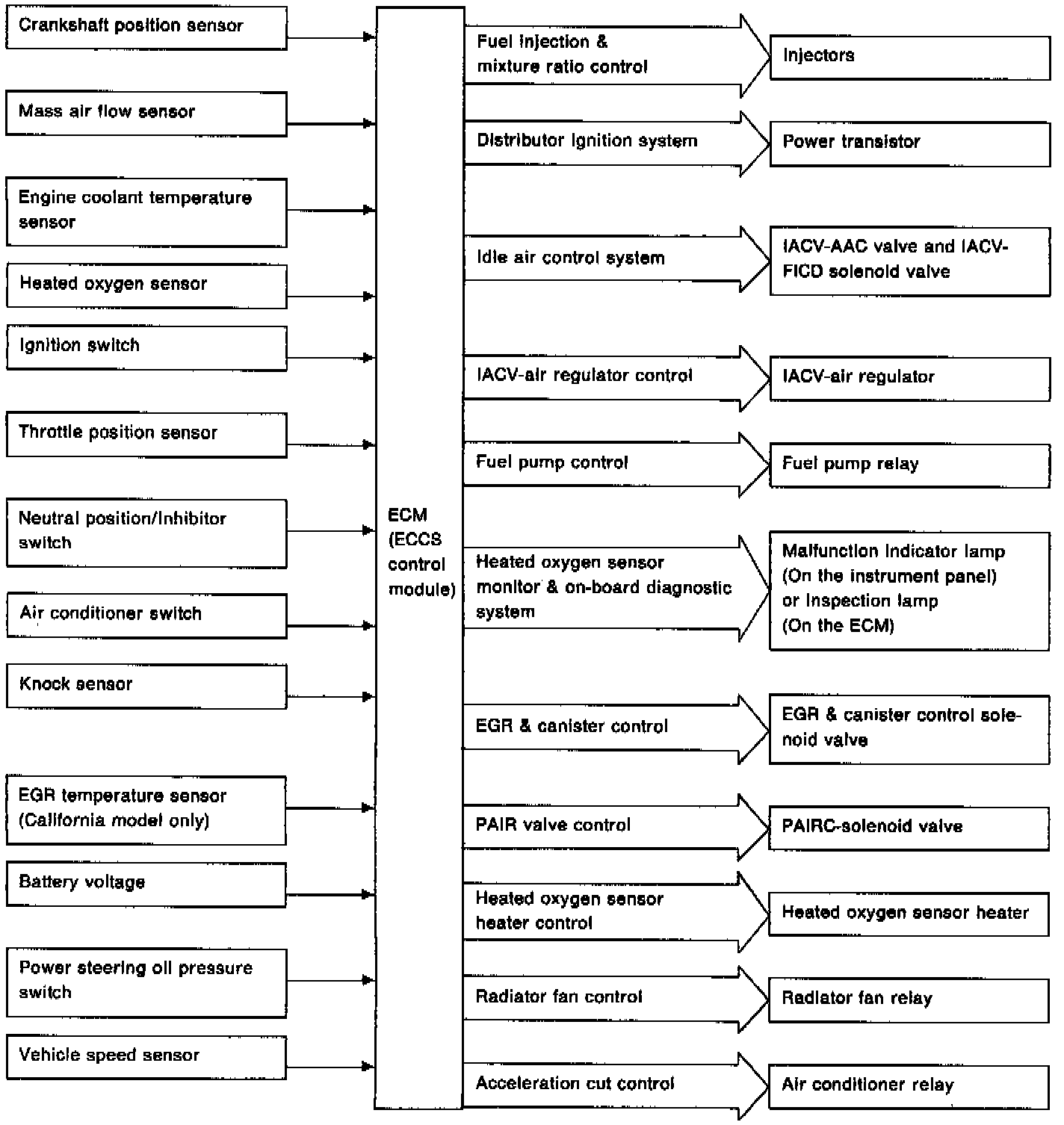 The Electronic Concentrated Engine Control System (ECCS) is used to provide precise control of the air-fuel ratio to the stoichiometric point. The Three way catalyst can then better reduce CO, HC and NOX emissions. The ECCS Control Module (ECM) adjusts the injector pulse width according to the sensor input voltages. This maintains the mixture ratio within the range of the stoichiometric air-fuel ratio.