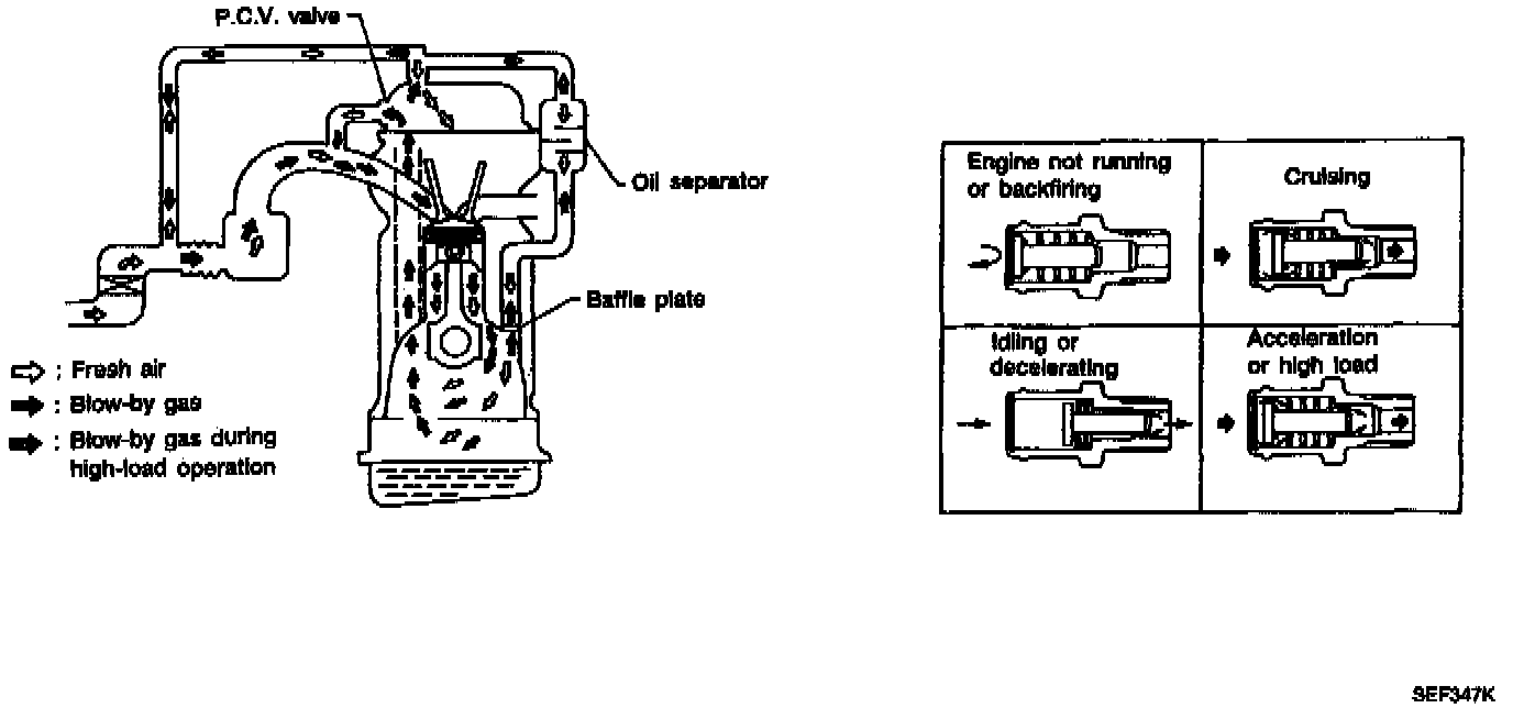 During partial throttle operation of the engine, the intake manifold sucks the blow-by gas through the P.C.V. valve. Normally, the capacity of the valve is sufficient to handle any blow-by and a small amount of ventilating air. The ventilating air is then drawn from the air inlet tubes, through the hose connecting air inlet tubes to rocker cover, into the crankcase. Under full-throttle condition, the manifold vacuum is insufficient to draw the blow-by flow through the valve, and its flow goes through the hose connection in the reverse direction. On vehicles with an excessively high blow-by some of the flow will go through the hose connection to the air inlet tubes under all conditions.