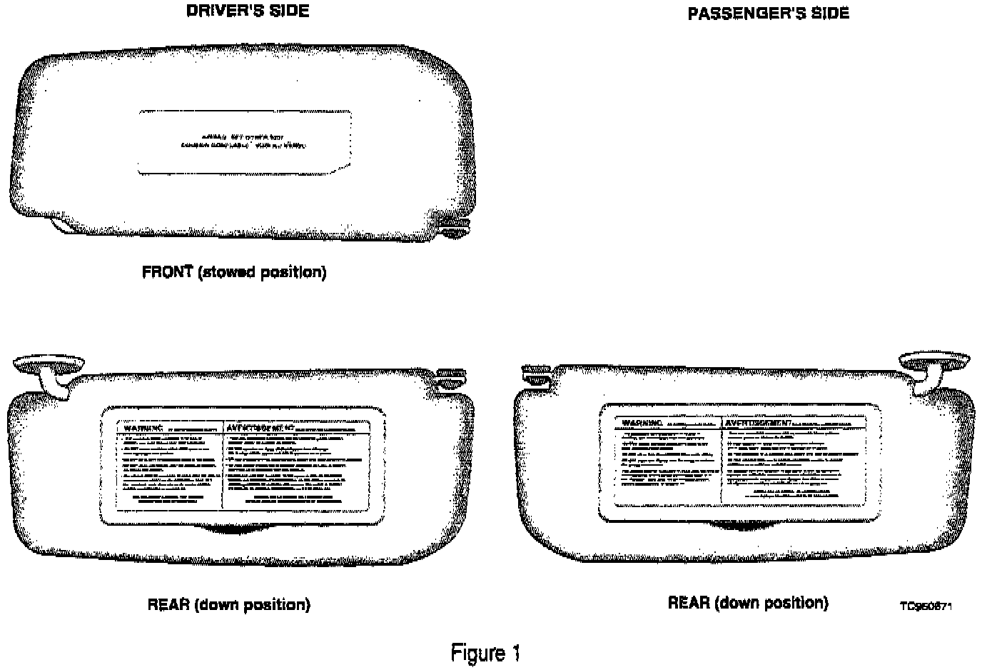 The owners will receive three labels; one for the front (stowed position) and one for the rear (down position) of the drivers visor; and one label for the rear of the passenger's visor. The label stating "Air Bag. See other side." (airbag label) goes on the front side of the driver's visor. The other two warning labels go on the rear side of the driver's and passenger's visors.