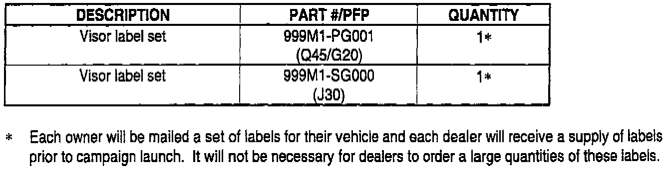 This bulletin is to notify you that Infiniti is initiating a field service action to replace existing sun visor labels on the applied vehicles. With an owner's letter, new labels and application directions, Infiniti is asking owners to affix the labels themselves, or if they prefer, they can have it done at a dealership. The owner's letter is attached for your reference.