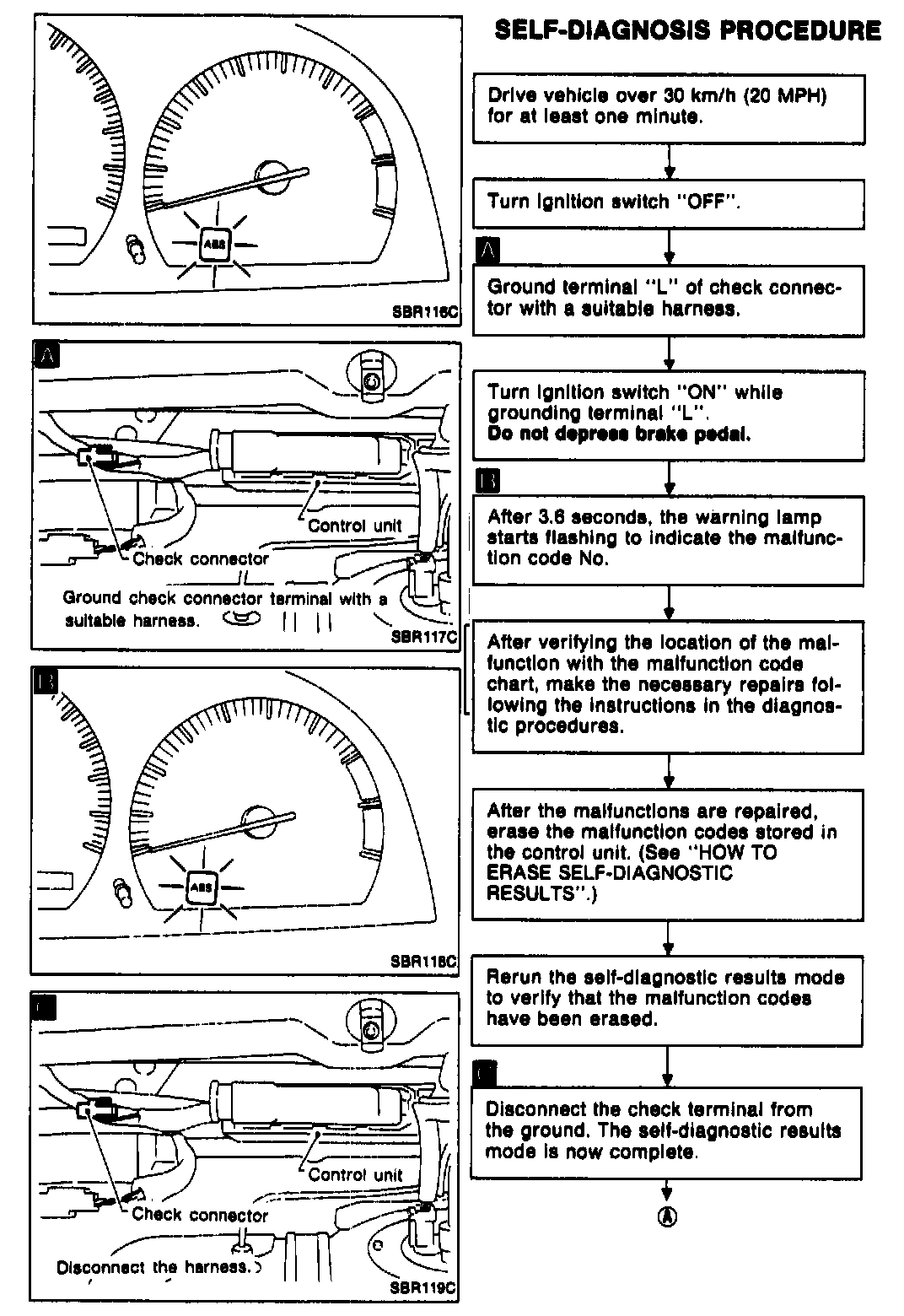 The warning lamp is also lit by grounding the self-diagnostic (check) terminal located on the check connector to actuate the self-diagnostic results mode. The location of the malfunction is indicated by the warning lamp flashing on the instrument panel.