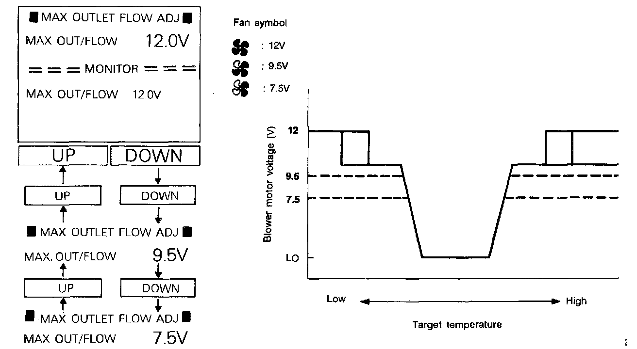 For passenger's comfort, maximum air flow of automatic control (blower motor voltage) can be set at three different levels. Operating procedure for this adjustment are as follows:
