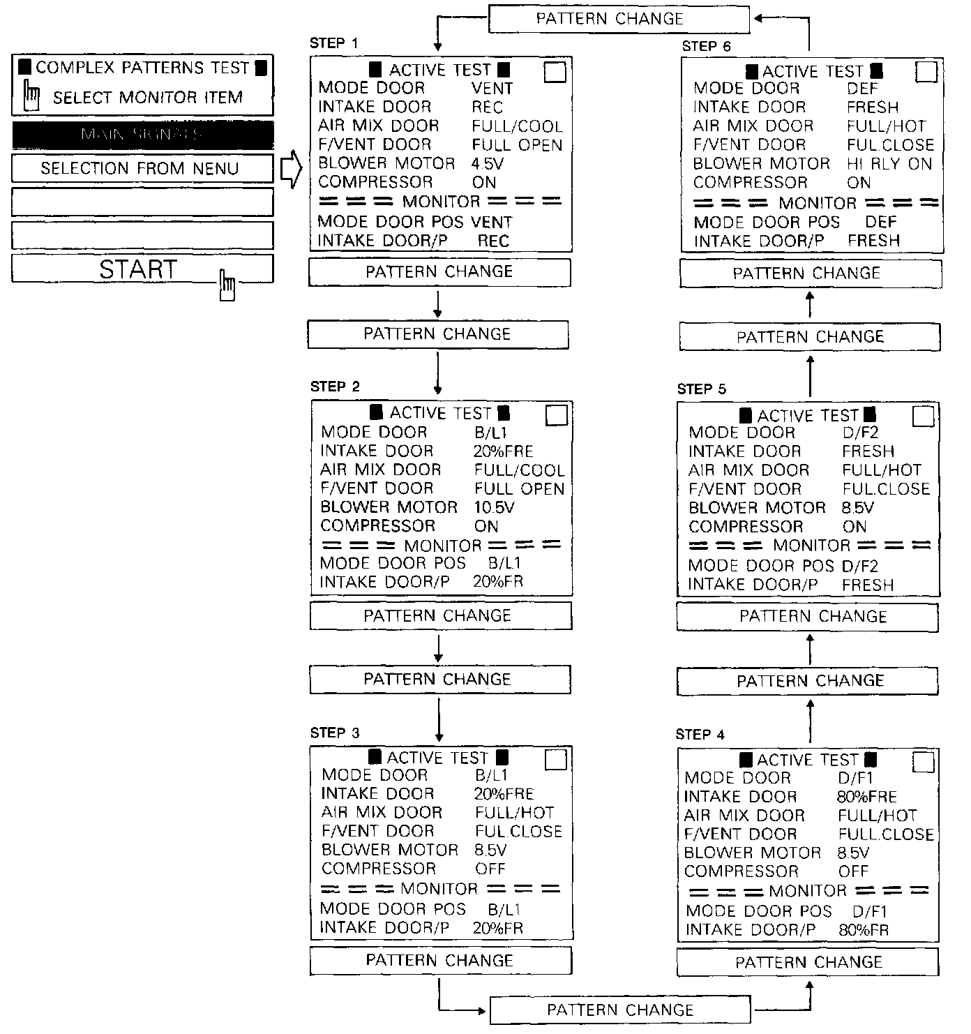 Checks must be made visually, by listening for noise, or by touching air outlets with hand, etc for improper operation. Touch "ACTIVE TEST".