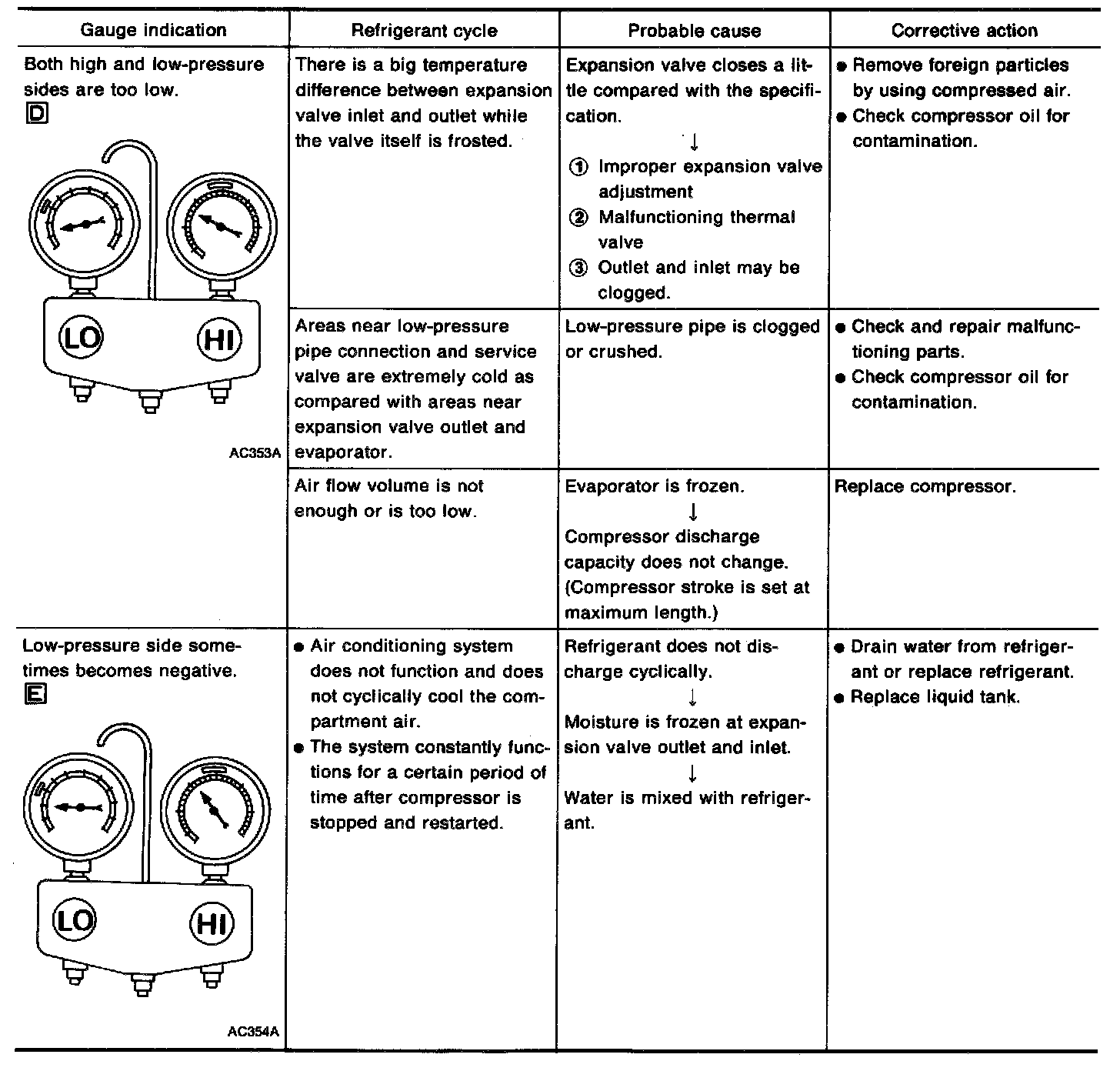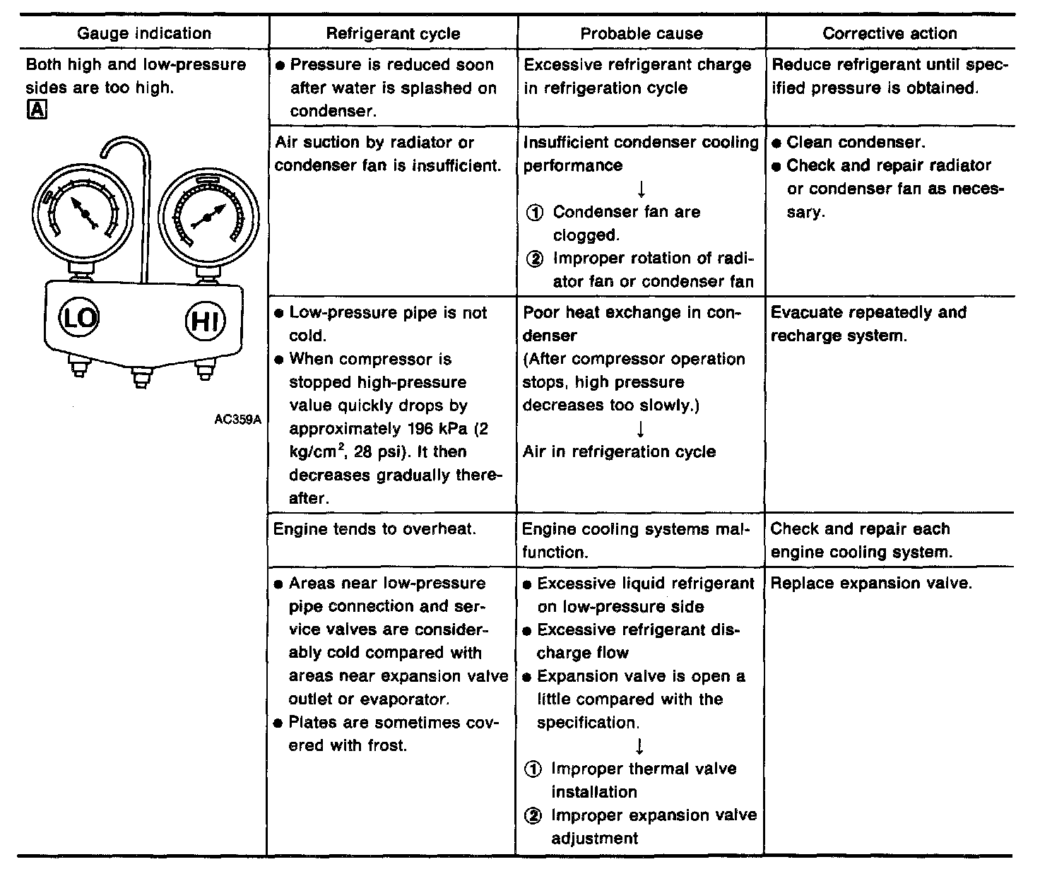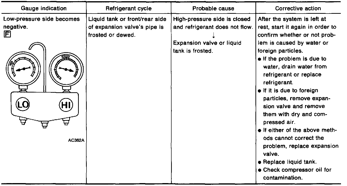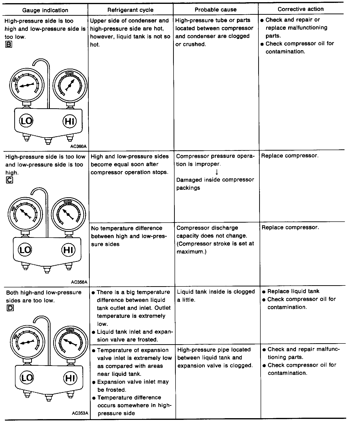 Whenever abnormal pressure of high and/or low sides of the system is noted, diagnosis must be conducted by using a manifold gauge. The large-line zone on the gauge scale (see illustrations.) shown in the following table refers to the standard (normal) pressure range for the corresponding pressure side (high or low). Since the standard (normal) pressure, however, differs from vehicle to vehicle, refer to the "Ambient Temperature-Pressure Characteristics" chart.