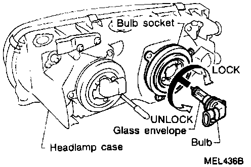 CAUTION: Do not leave the bulb out of the headlamp reflector for a long period of time as dust, moisture, smoke, etc. may enter the headlamp body and affect the performance of the headlamp. Thus, the headlamp bulb should not be removed from the headlamp reflector until just before a replacement bulb is to be Installed.
