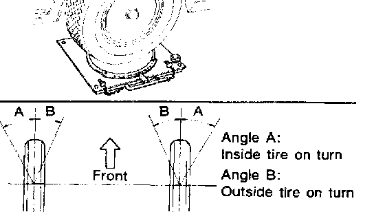 1. Set wheels in straight ahead position. Then, move vehicle forward until front wheels rest on turning radius gauge properly.2. Rotate steering wheel all the way right and left and measure turning angle.