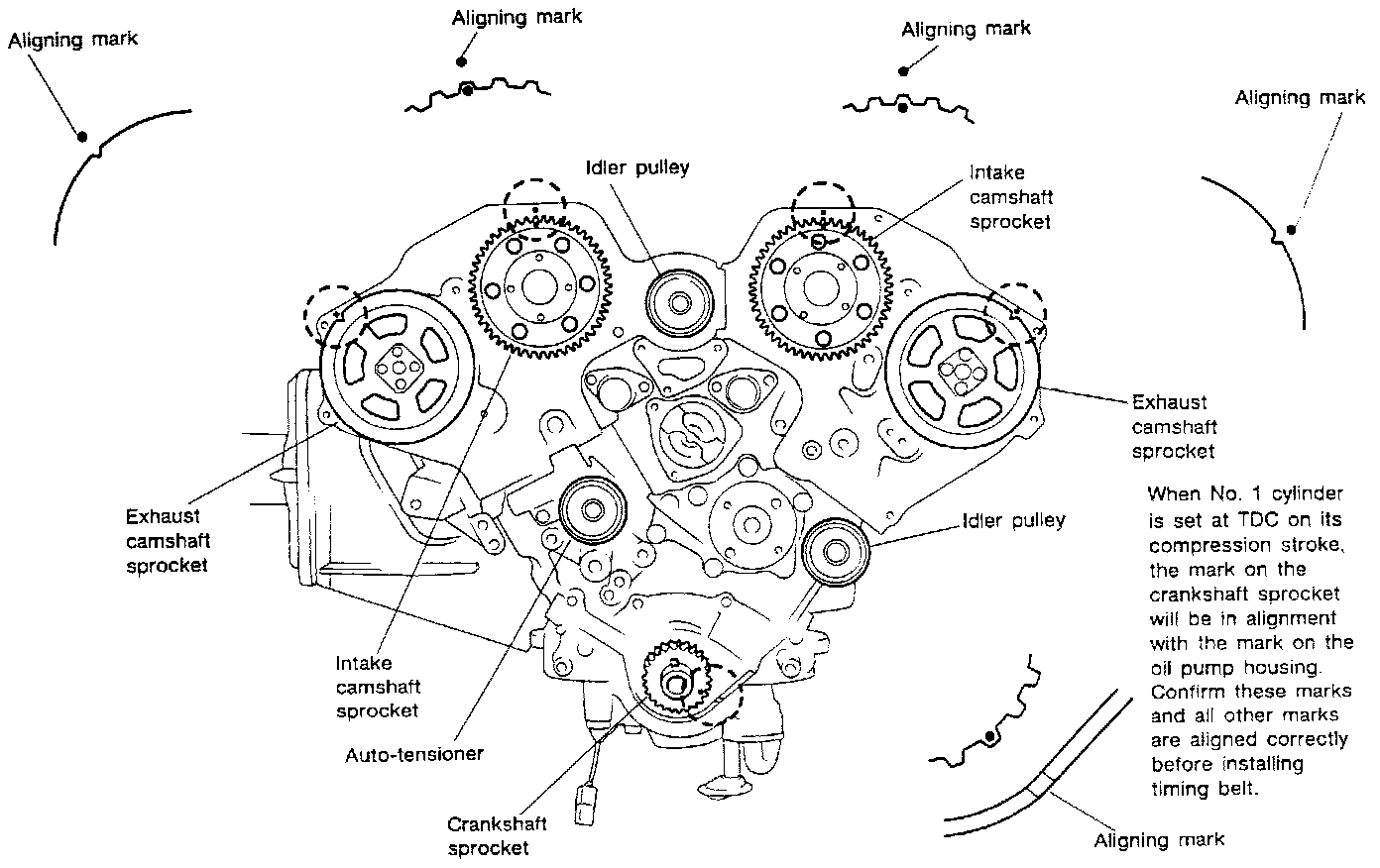 2. Align matching marks on camshaft and crankshaft sprockets with aligning marks on rear belt cover and oil pump housing.