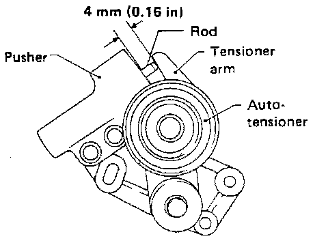 5. Adjust tensioner arm to give 4 mm (0.16 in) clearance with pusher of auto-tensioner using a suitable vise. and then insert stopper bolt into tensioner arm in order that clearance does not change.