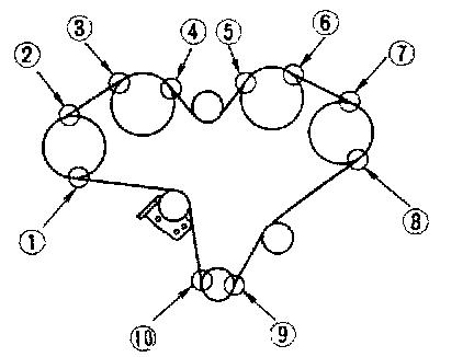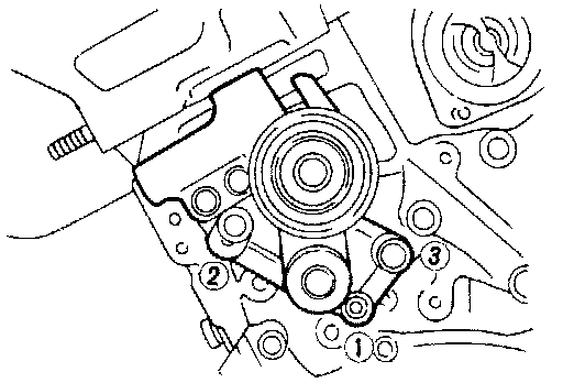 Set tensioner slightly by pushing timing belt. Then, turn crankshaft 10 degrees clockwise and tighten nut (1) and bolts (2) and (3) to 16 - 21 Nm (1.6 - 2.1 kg) (12 - 15 ft lb).