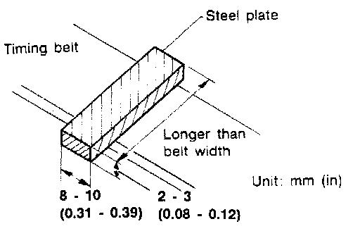 (1) Set plate and push it with 49 N (5 kg, 11 lb) force using Tool (push-pull gauge) at each position of timing belt mid-way between pulleys as shown.