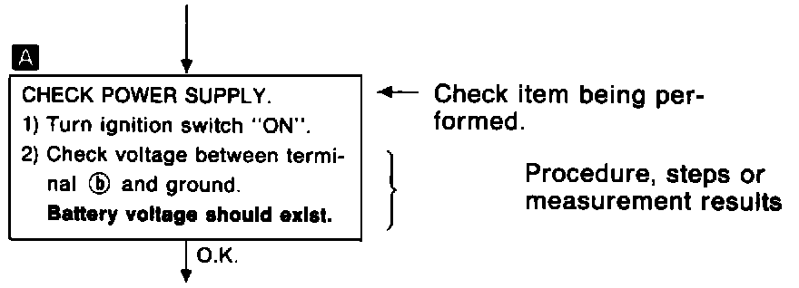 Illustrations are provided as visual aids for work procedures. For example, symbol A indicated in the left upper portion of each illustration corresponds with the symbol in the flow chart for easy identification. More precisely, the procedure under the "CHECK POWER SUPPLY" outlined previously is indicated by an illustration A.
