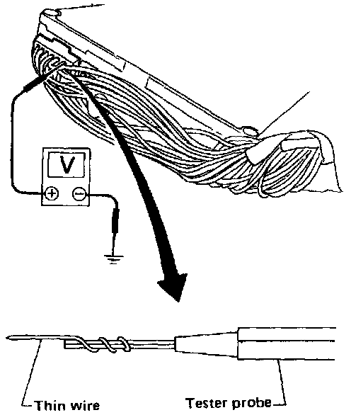 2. Perform all voltage measurements with connectors connected. Extend tester probe as shown to improve access and reduce the chance of damaging pin connectors.