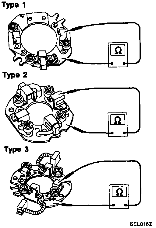 1. Perform insulation test between brush holder (positive side) and its base (negative side).
