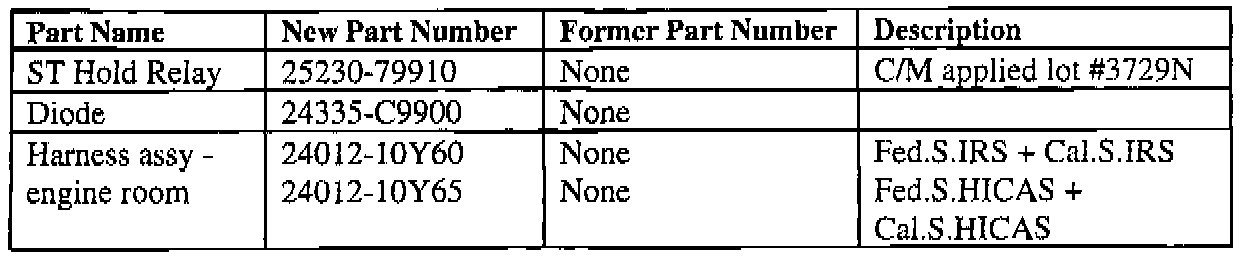 The table shows part number changes for the engine room harness, countermeasure ST hold relay lot number, and relay location. A circuit wiring diagram has been included for your reference.