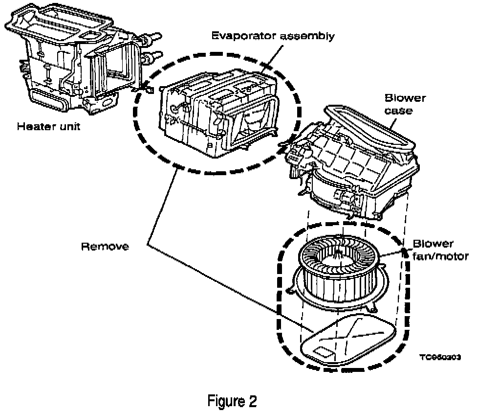 4. Remove the A/C evaporator assembly as shown in Figure 2.
