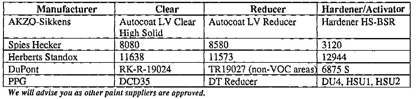 Nissan is working with refinish paint vendors to develop approved materials and procedures for proper refinishing of vehicles with NCLC. To ensure proper color matching, adhesion, and long term wear characteristics, vehicles needing paint refinish work must be refinished with products that have been tested and approved by Nissan for use with this unique new clear coat finish. At the time of this publication, refinish paint manufacturers have provided materials and procedures which meet Nissan requirements: