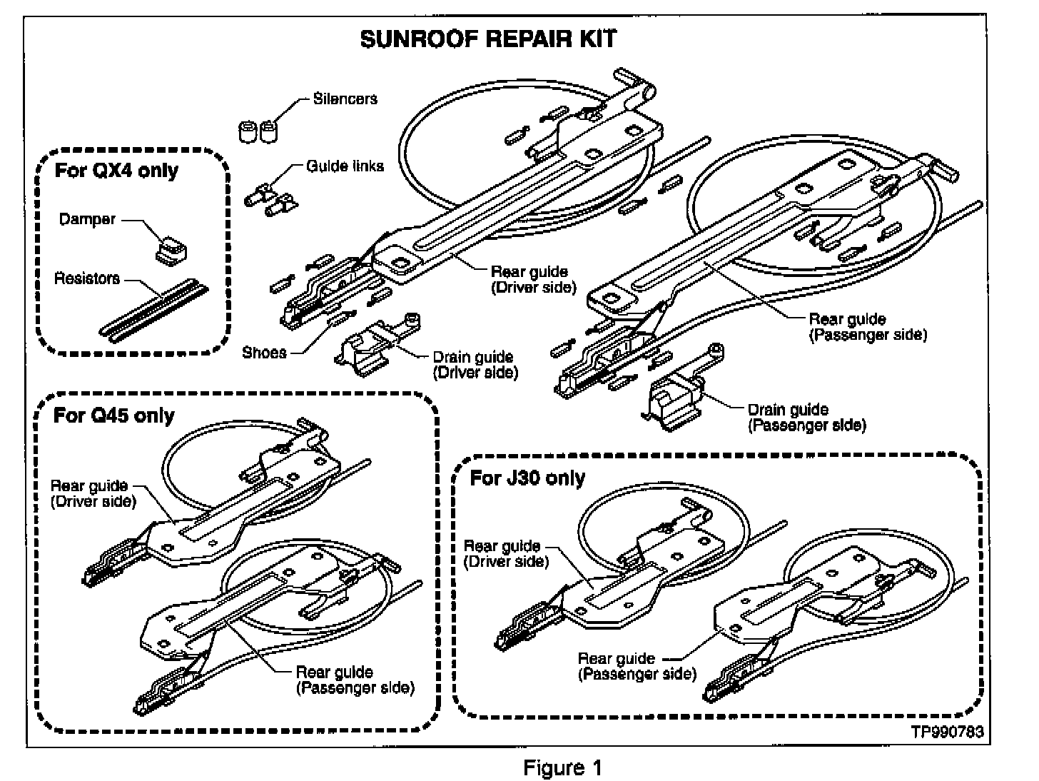 NOTE: Most QX4 vehicles already have two resistors mounted to either the front or rear of the sunroof rail assembly. Install two additional resistors (provided in the kit) so the sunroof rail assembly has four resistors when you are done.