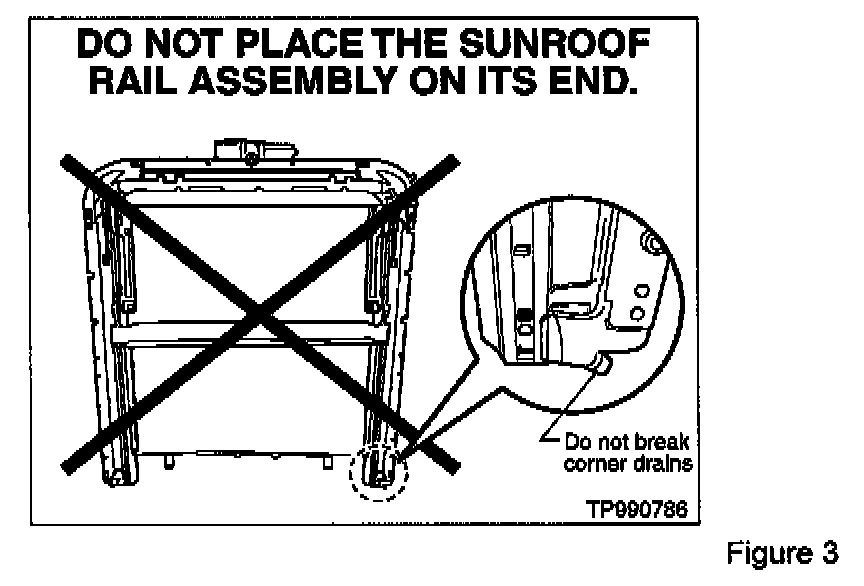 - Do not place the sunroof rail assembly on its end as damage to the corner drains may occur (see Figure 3).