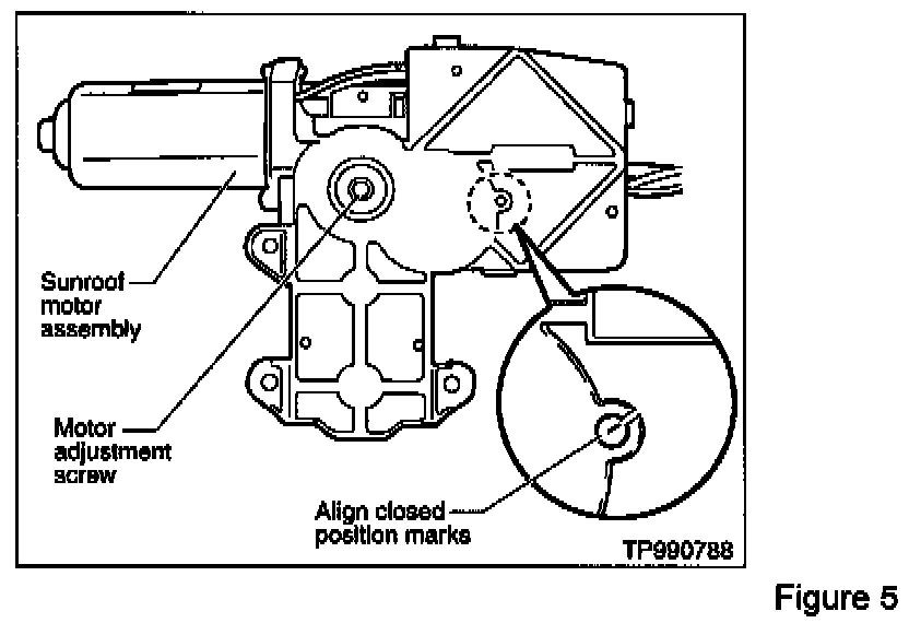 NOTE: Make sure the closed position marks on the motor are still lined up with each other before installing the motor on the sunroof rail assembly. If necessary, turn the motor adjustment screw until the marks are aligned.