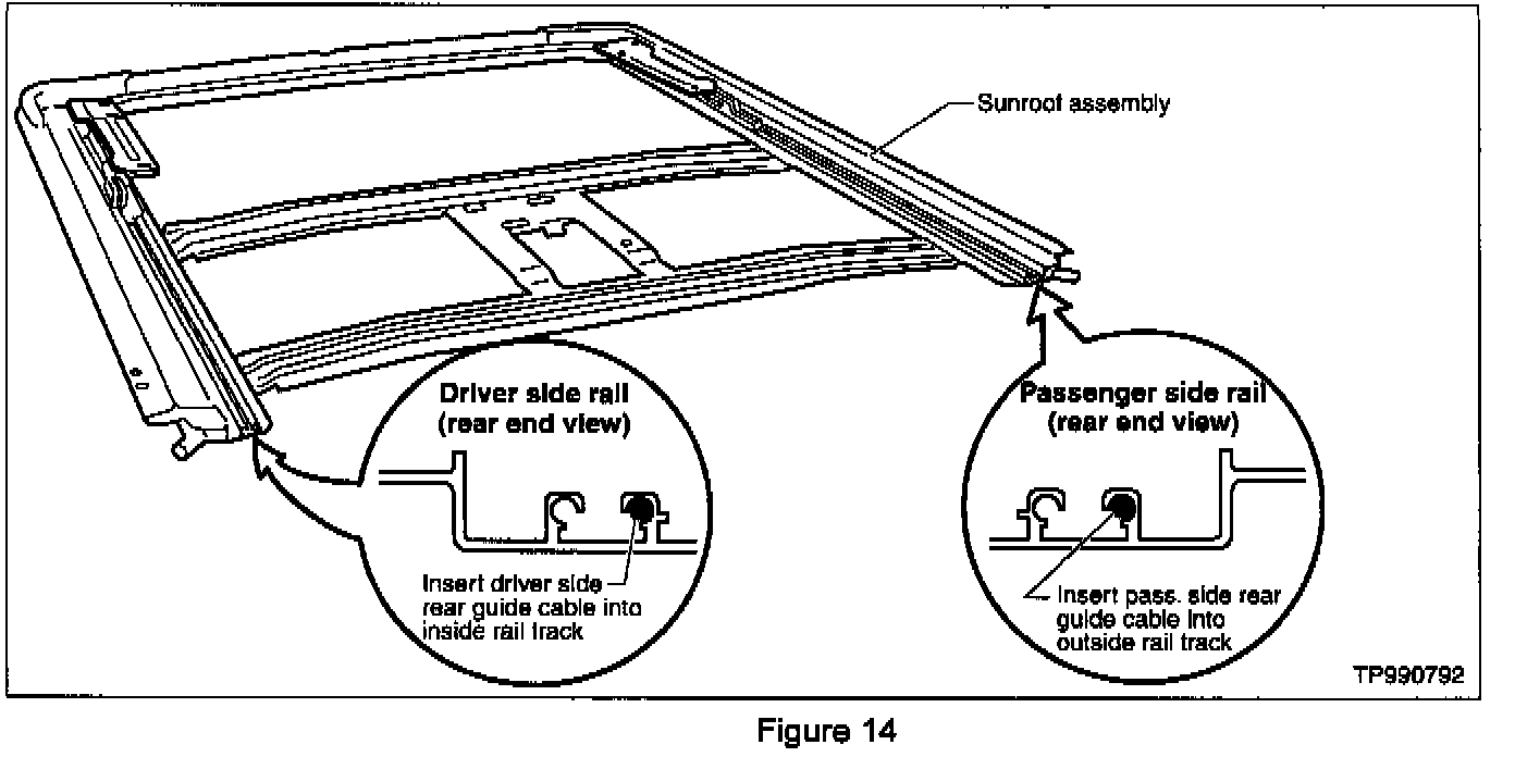 NOTE: The passenger side rear guide cable slides into the outside rail track and the driver side rear guide cable slides into the inside rail track (see Figure 14).