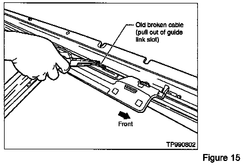 NOTE: If the original cable was broken and still remains in the sunroof rail assembly, push the new cable into the sunroof rail assembly until it pushes the broken cable to the guide link slot, then use pliers to pull the old cable out through the slot (see Figure 15).