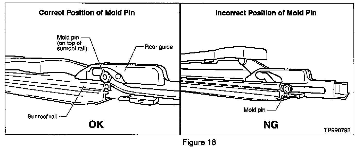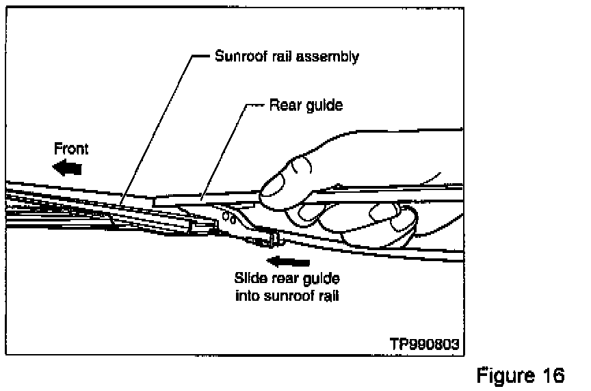 B. First, insert the front of the new rear guide into the sunroof rail (see Figure 16), then pull the guide towards the front of the sunroof rail assembly until the rear guide slides into the sunroof rail (see Figure 17). Make sure the mold pin is placed on top of the rail (see Figure 18) when inserting the rear guide.