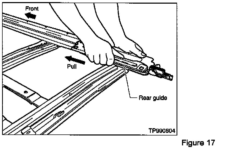 17. Verify the rear guides slide smoothly and quietly in the sunroof rail assembly, then move the guides completely forward.