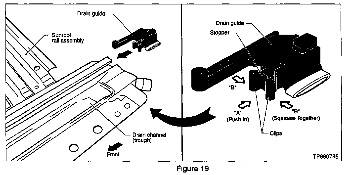 B. Insert the drain guide into the end of the sunroof rail assembly (see Figure 19) and slide it forward until it snaps into the cut-out in the rail.