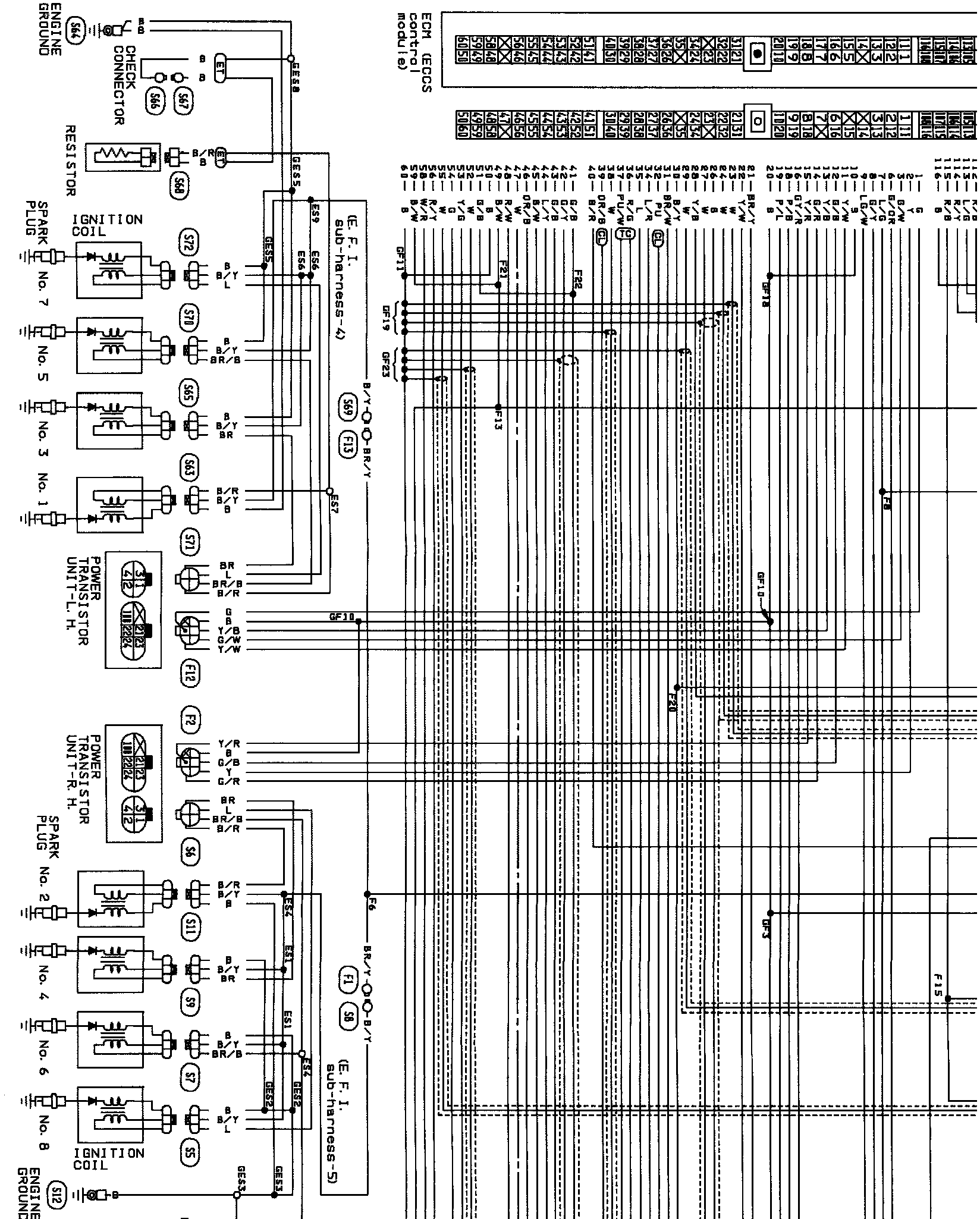 The Electronic Concentrated Engine Control System (ECCS) is used to provide precise control of the air-fuel ratio to the stoichiometric point. The Three way catalyst can then better reduce CO, HC and NOX emissions. The ECCS Control Module (ECM) adjusts the injector pulse width according to the sensor input voltages. This maintains the mixture ratio within the range of the stoichiometric air-fuel ratio.