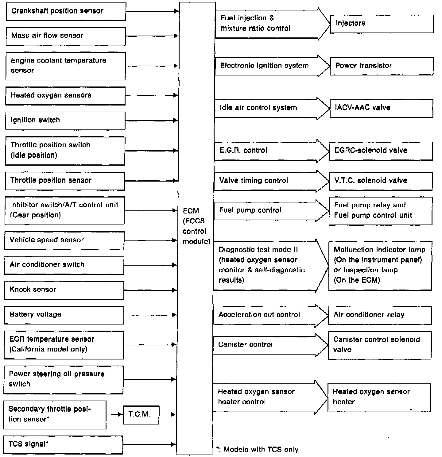 The Electronic Concentrated Engine Control System (ECCS) consists of sensors which detect the engine condition, the ECCS Control Module (ECM) which controls the engine on the basis of the sensor signals, and actuators which operate under control of the ECM. The ECM controls the Fuel Injection, Idle Control, Ignition Timing, Engine Cooling Fan, Exhaust Gas Recirculation, Evaporative Canister, Variable Valve Timing, and Fuel Pump Systems. In addition, the ECM is provided with 2 diagnostic test modes (DTM) to facilitate troubleshooting in case of failure.