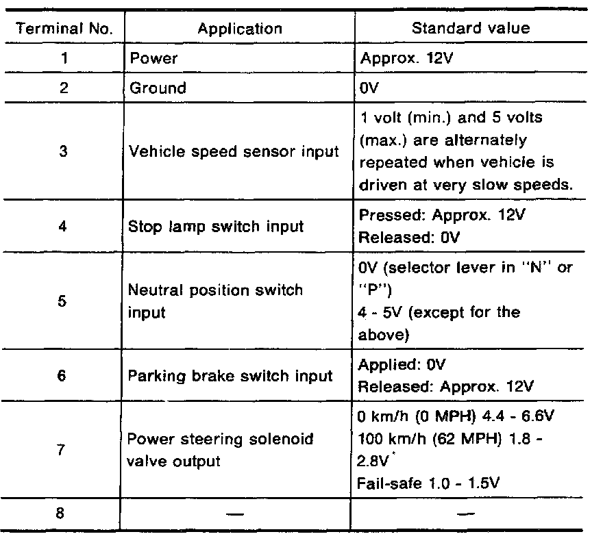 The standard values (voltage), measured with an analog tester in contact with the control unit terminal, are shown below: